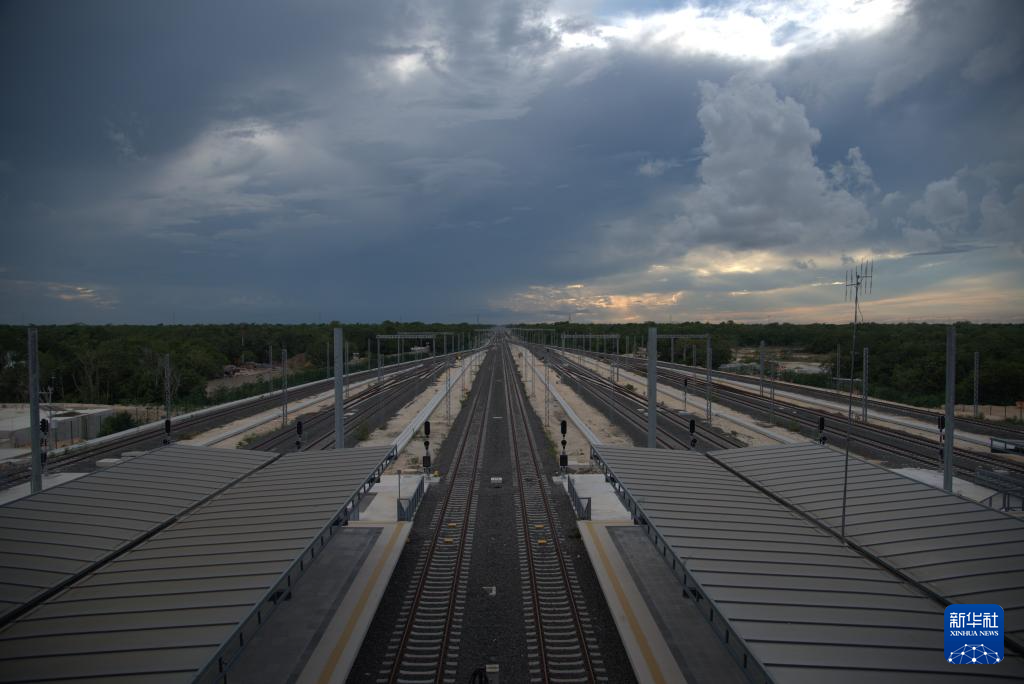 这是10月4日在墨西哥玛雅铁路坎昆机场站拍摄的铁轨间群策略。新华社记者 翟淑睿 摄