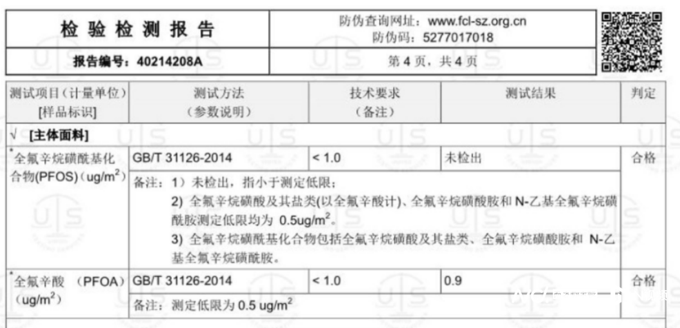 完整检测报告显示PFOA未检出