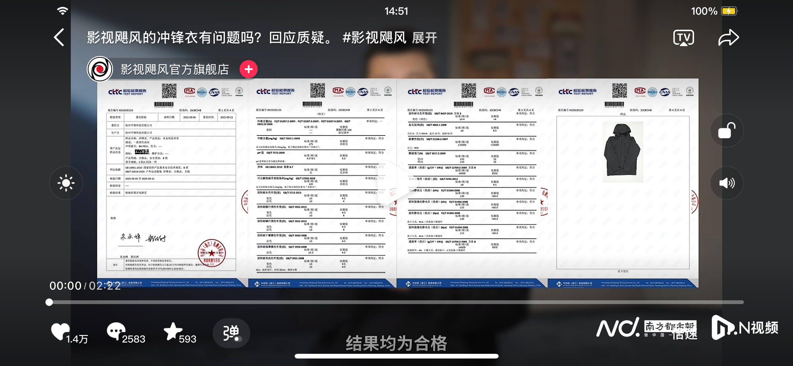 在视频中,影视飓风还提供了冲锋衣的完整检测报告。南都湾财社记者查询发现,该检测报告为中纺标(浙江)检测有限公司于9月11日出具,样品为冲锋衣,各个检测项目均符合国家标准,但未见包含PFOA的检测项目。