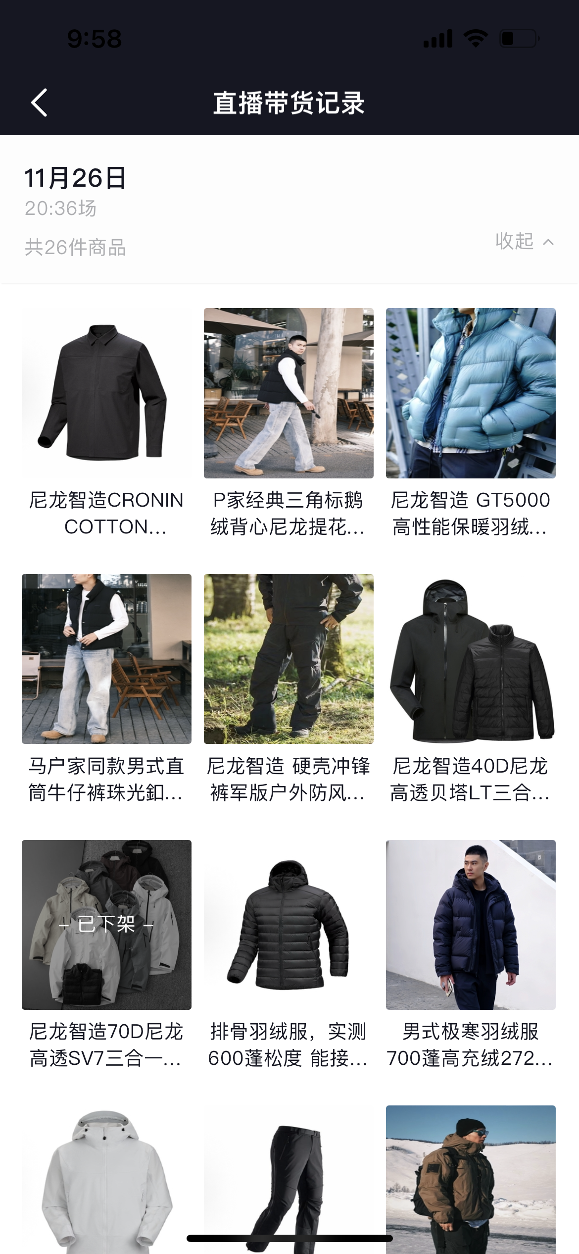 另外,小韩哥最近30日内有5场直播带货记录,每场直播带货产品有24-26件,均为服装产品,其中也涉及多款冲锋衣产品。另外,带货的品牌主要涉及尼龙智造,产品店铺电商信息显示为台州尼龙鸟智造科技。
